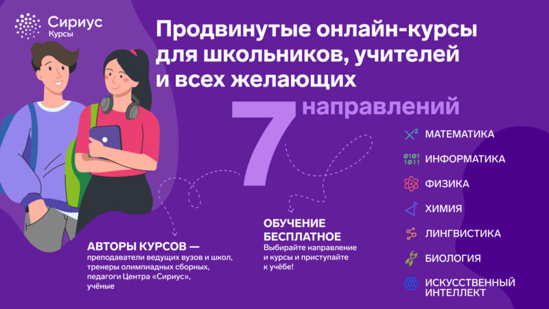На главной странице Сириус.Курсов можно найти более 50 программ по семи направлениям. Все они бесплатные. Проходить курсы можно в своём темпе, нужен лишь доступ в интернет.